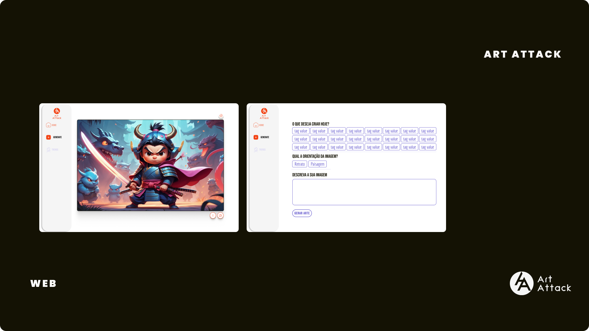 Inspirado no projeto Fantare, o Art.Attack é um aplicativo/web aplicativo que transformava a maneira de se utilizar a I.A. com mais facilidade, através de uma prática mais comum, e fácil e interação para se ter um resultado prático e eficiente ao desejado.